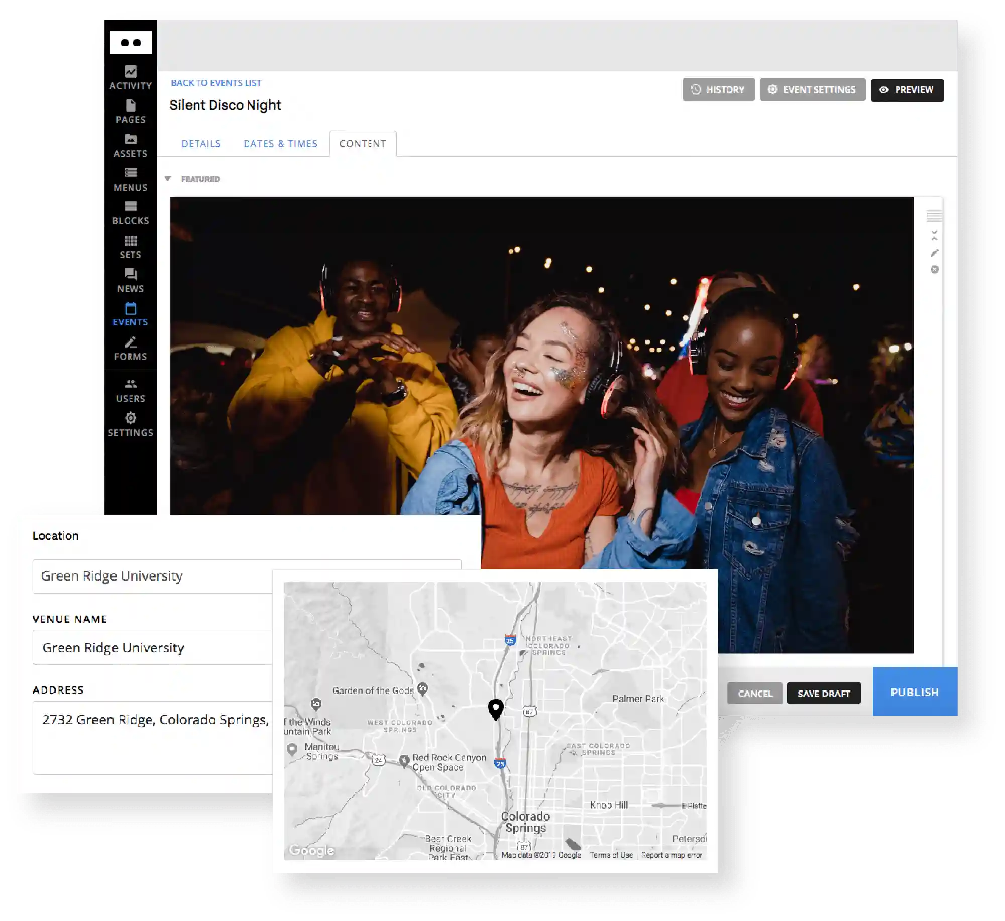 The BlokBlok Events module gives brands the ability to promote events through a calendar on their website or application. Events empowers content managers to create one-time and recurring events and to manage multiple venues. The Events module can be connected to your favorite event registration system, like Eventbrite or Showclix.